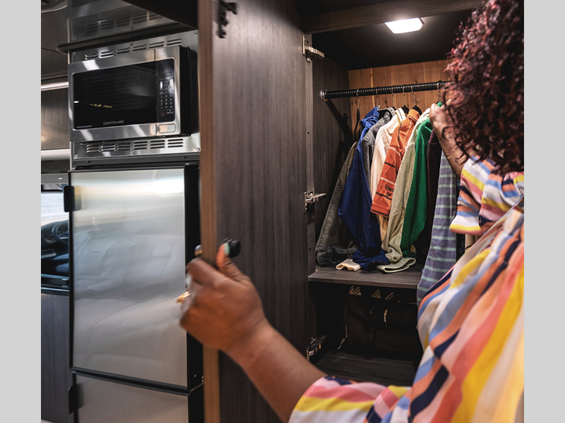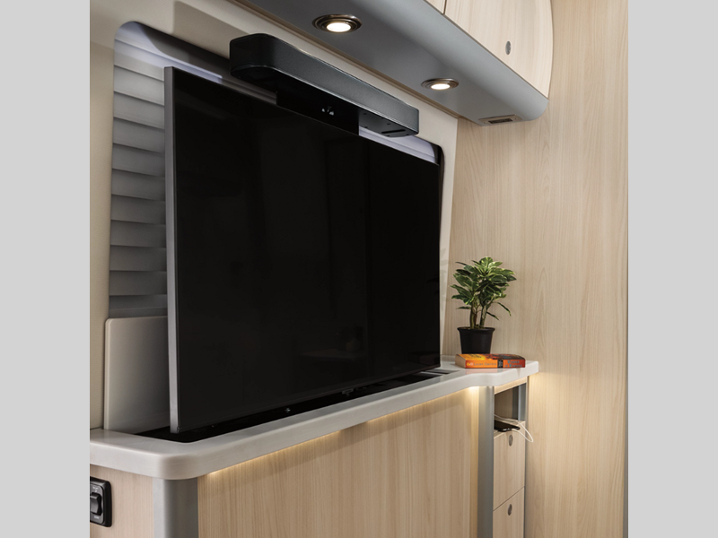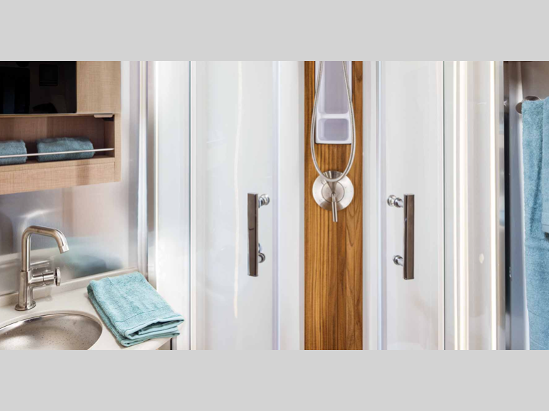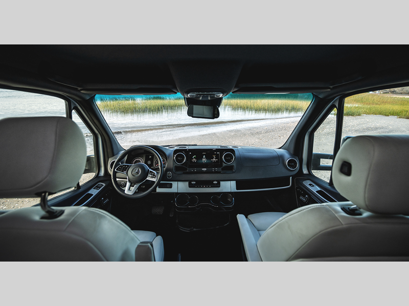 The coach is built on a Mercedes-Benz Sprinter van chassis, and includes active safety systems that automatically provide additional safety on the road such as active brake assist, driver attention assist, and active distance assist, distronic plus. The interior offers a cockpit with advanced in-dash technology and heated, swivel driver/passenger seats, plus the lavatory provides a stand-alone, corner shower with teak wall inlay, a Kohler faucet, shower head and sink, and a riveted aluminum porthole door.