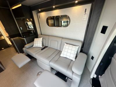 Get ready to explore, unwind and "glamp" where ever you decide! This coach brings you everything you will need, plus much much more! The power slide offers a Murphy suite that retracts and fits seamlessly with the luxury automotive body style. With a touch of a button on the multiplex control panel, you will have more floor space to relax on the reclining sofa that includes two seatbelts or pull down the Murphy bed at night. There is more seating on the captain's chairs that swivel around to face the interior, and there are two tables that adjust to different heights for your needs. The kitchen provides a cooktop and large stainless steel Kohler sink and faucet, and there is a convection microwave, a slide-out pantry and a refrigerator with a freezer a few steps away.